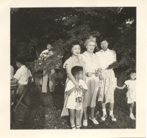 The most startling moment in my research process at the MOHAI happened during an email exchange with a staff member at Densho, a nonprofit that has documented the oral histories of Japanese Americans who were incarcerated. In a gracious response to my request for any oral histories or photos connected to Bailey Gatzert Principal Ada Mahon, I received a list of photos. As I scrolled through each photo, one caught my eye: a photo of Principal Mahon visiting Japan in the 1950s to visit her former students. In this photo, Principal Mahon stood smiling at the center, with “unidentified” families next to her. Immediately, I realized she was standing next to my grandmother and father as a young boy. Through my research of these forgotten dolls, I was able to better understand my own family’s story—a story that traces continents and generations, marked forever by the incarceration, but ultimately a story of resilience and love.
