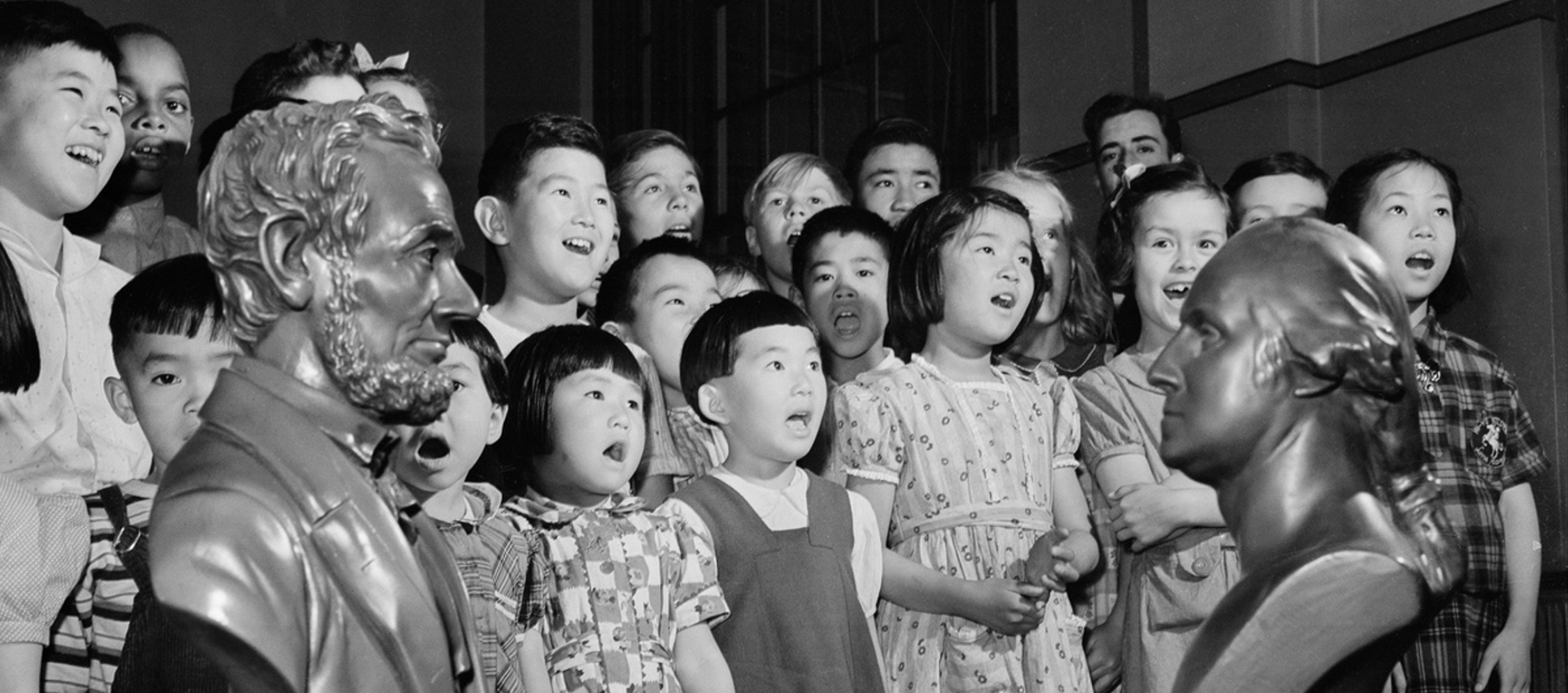 Bailey Gatzert School students singing near statues of Lincoln and Washington, Seattle, 1941. Credit: MOHAI